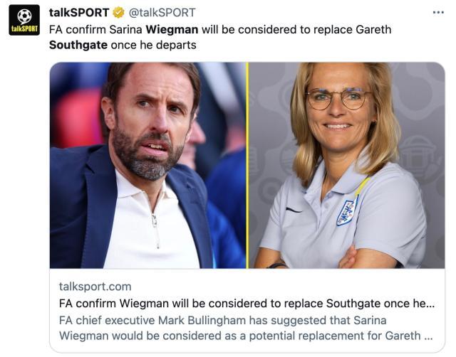 英格兰男足上一次夺得大赛冠军还是1966年的本土世界杯,虽然英国人一直唱着“足球回家”,但他们或许没有想到会有“足球回娘家”的一天。不是英国媒体造势,而是世界最古老的足球机构英足总做出了设想,足总CEO马克·贝林厄姆向媒体确认,足总有在考虑让维格曼接手索斯盖特的工作,带领英格兰男足打破无冠局面,当然,考虑到公众能接受的程度尚处未知,目前他的口吻只是带点试探性的“如果”,“为什么不?”
